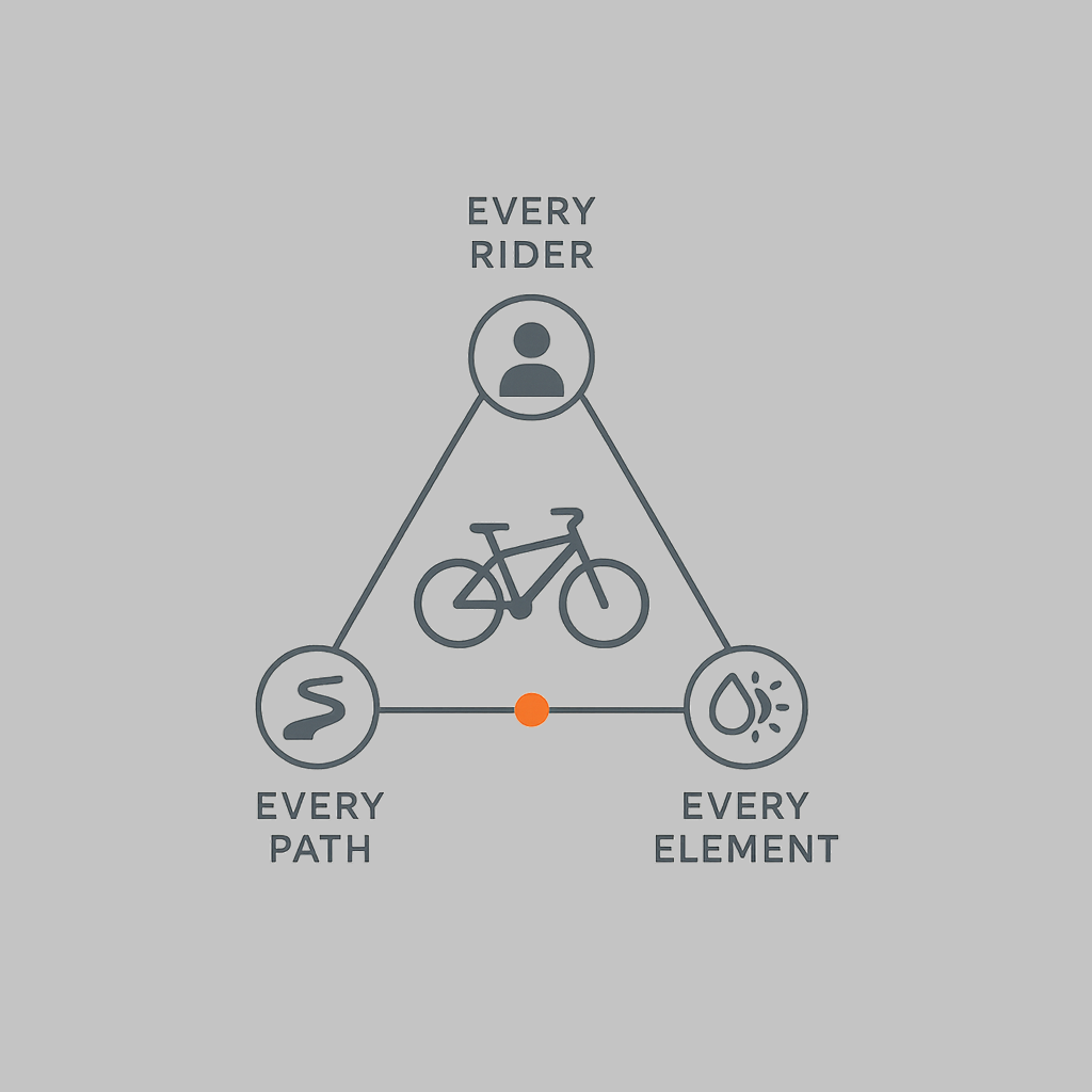 We design for the conditions you actually face: rain on your Monday commute, hills with a loaded cargo rack, gravel paths that connect your neighborhood to the trail network.